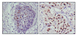 p53 responds to diverse cellular stresses to regulate target genes that induce cell cycle arrest, apoptosis, senescence, DNA repair, or changes in metabolism. p53 protein is expressed at low level in normal cells and at a high level in a variety of transformed cell lines, where it's believed to contribute to transformation and malignancy. p53 is a DNA-binding protein containing transcription activation, DNA-binding, and oligomerization domains. It is postulated to bind to a p53-binding site and activate expression of downstream genes that inhibit growth and/or invasion, and thus function as a tumor suppressor. Mutants of p53 that frequently occur in a number of different human cancers fail to bind the consensus DNA binding site, and hence cause the loss of tumor suppressor activity. Alterations of this gene occur not only as somatic mutations in human malignancies, but also as germline mutations in some cancer-prone families with Li-Fraumeni syndrome. Multiple p53 variants due to alternative promoters and multiple alternative splicing have been found. These variants encode distinct isoforms, which can regulate p53 transcriptional activity.