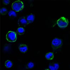 ROR1, a type I membrane protein, is a receptor protein tyrosine kinase that modulates neurite growth in the central nervous system. The ROR-family receptor tyrosine kinases consist of two structurally related proteins, ROR1 and ROR2. These proteins are characterized by having intracellular tyrosine kinase domains, which are highly related to Trk-family kinases, extracellular Frizzled-like cysteine-rich domains (CRDs) and Kringle domains. The ROR family members are highly conserved among species, such as C. elegans, Drosophila, Xenopus and mammals. ROR1 and ROR2 are both involved in organogenesis with particular emphasis in neuronal differentiation. Increased expression of ROR1 in acute lymphoblastic leukemias (ALLs) as well as chronic lymphocytic leukemias (CLLs) implicate this protein as a potential tool for targeted immunotherapy in these diseases.